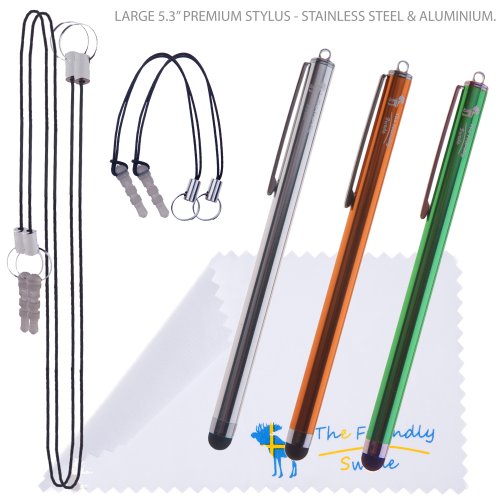 CONTENTS - In The Friendly Swedeยฎ retail packaging:3 x Premium Large 5.3" Universal stylus touch screen pen in stainless steel and aluminum, no plastic parts and with the feeling of a real pen - Choose your three favorite colors!