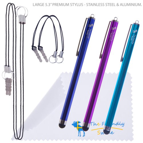CONTENTS - In The Friendly Swedeยฎ retail packaging:3 x Premium Large 5.3" Universal stylus touch screen pen in stainless steel and aluminum, no plastic parts and with the feeling of a real pen - Choose your three favorite colors!